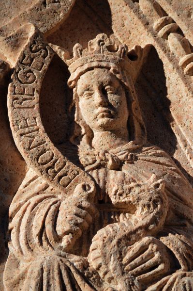 Figura 3- Una delle Virtù Cardinali della lunetta in Pietra di Finale sulla facciata del Palazzo del Tribunale a Finalborgo (1462).